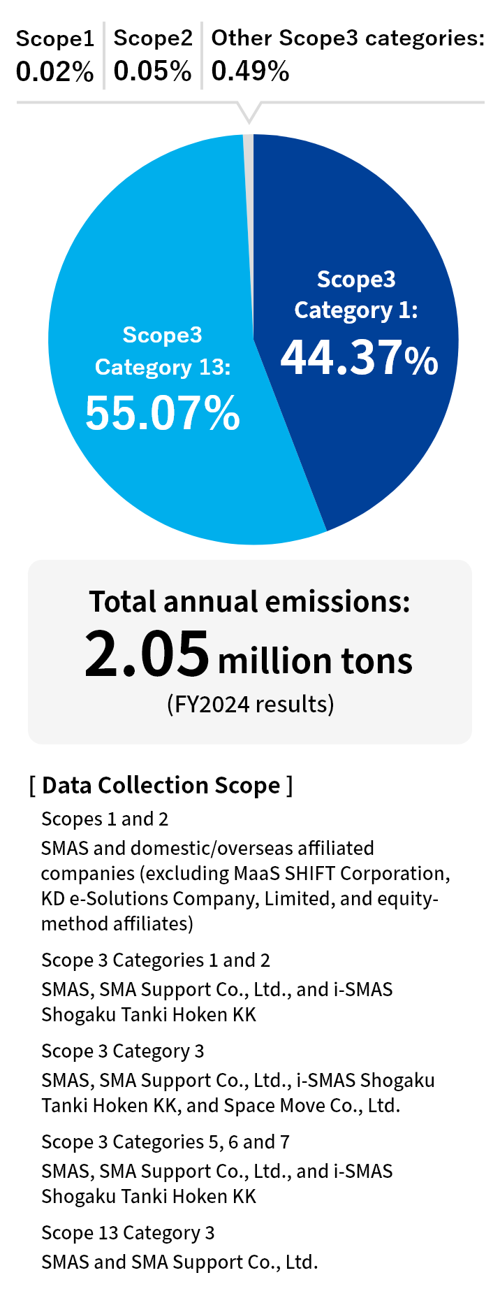 In addition to calculating GHG emissions for Scopes 1 and 2, SMAS expanded its calculation boundary to include Scope 3 starting in FY2022. Initially, the data aggregation scope covered SMAS alone. For Scopes 1 and 2, the calculation boundary has since been expanded to include domestic affiliates and then overseas affiliates (excluding MaaS SHIFT Corporation., KD e-Solutions Company, Limited, and equity-method affiliates). Going forward, the Company plans to extend the Scope 3 calculation boundary to include affiliates as well.