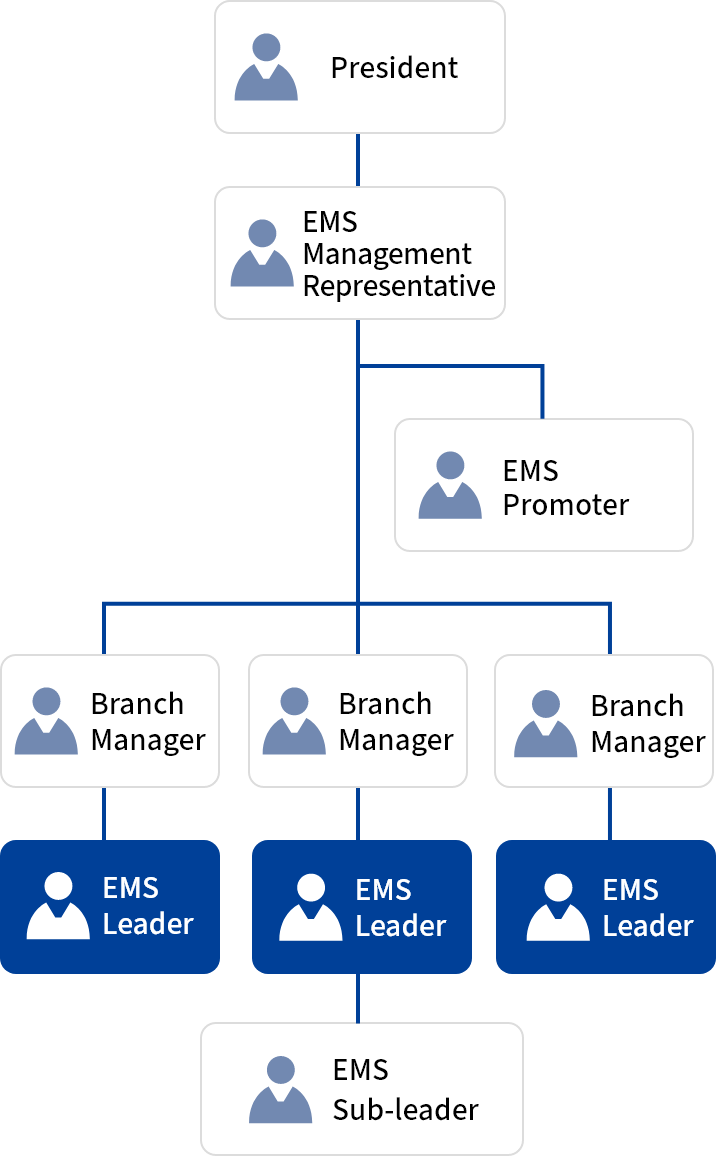 SMAS carries out environmentally conscious business activities every day with the aim of helping to create a global environment in which future generations can live with peace of mind. To promote these initiatives at the operational level, EMS (Environmental Management System) Leaders are assigned to branch offices nationwide, ensuring that environmental efforts are firmly rooted in frontline activities.