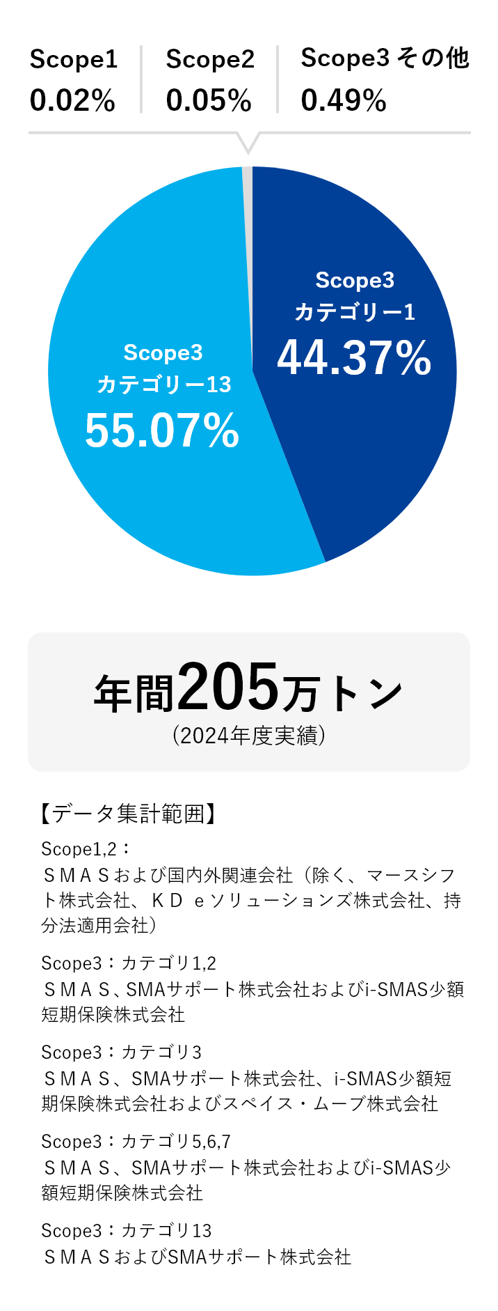 SMASからの直接的な排出ではないものの、サプライチェーン全体で占める割合が高く、脱炭素社会を目指すためには、特にウエイトが高いカテゴリ13「リース資産(下流)」の使用に伴うGHG(温室効果ガス)排出量の削減が必要不可欠です。